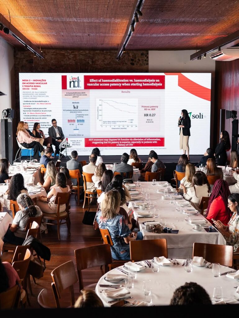 Abrindo a programação, a nefrologista Dra. Maria Gabriela Guimarães, membro da Comissão Científica do evento, trouxe uma análise de evidências recentes sobre a hemodiafiltração (HDF), terapia de substituição renal que combina as técnicas de hemodiálise e hemofiltração para remover toxinas, resíduos metabólicos e excesso de fluidos do sangue de pacientes com insuficiência renal.
